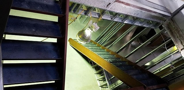 Concrete must be poured into the stairs and the landing. Tiles will then be placed into the stairs for finishing. Notice the rough-ins for plumbing on the ground floor. This is for the bar that will be located in the middle of the atrium staircase.